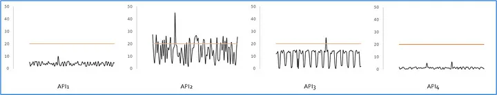 Following figure shows an example of response time of 4 APIs. Here the SME has used tacit knowledge to set a blanket threshold of 20ms for API response times for all the APIs. As the figure shows, different APIs have different value ranges and setting a blanket threshold of 20ms will generate too many alerts in some APIs, and will miss some genuine anomalies in some APIs.