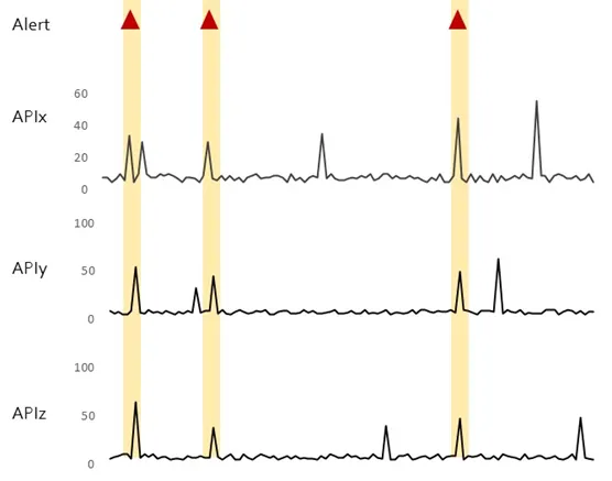 Following figures shows an example of the response time of 3 APIs, and how an alert gets generated only then all 3 APIs demonstrate a high response time.