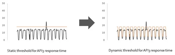 Following figure shows that the response time of API 3 demonstrates temporal patterns where the response if high on weekdays and low on weekends. Here, instead of a static threshold, a dynamic threshold is recommended showing higher thresholds on weekdays and lower thresholds on weekends.