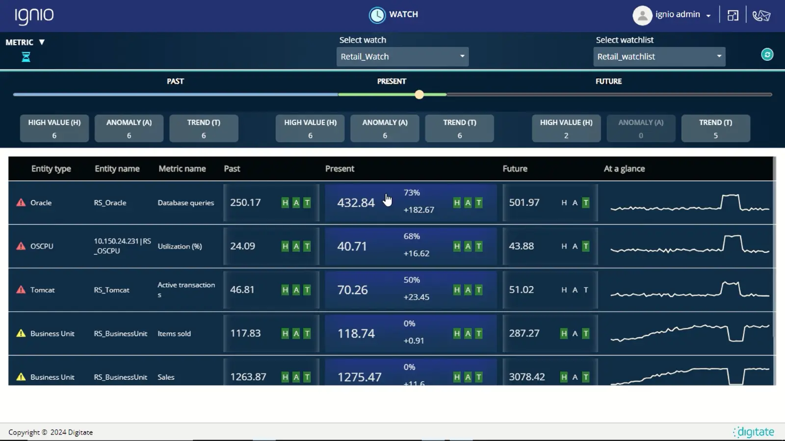 ignio’s Metric Watch addresses these limitations. Metric Watch is an AI-powered feature to view the past, present, and future of metrics/KPIs in real-time with the following key aspects: