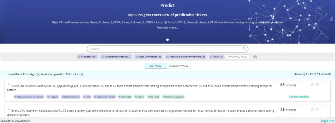 - Not all predictable incidents may show temporal patterns. Some incidents may not have strong temporal occurrences, but they show a clear pre-condition. For example, when the disk is more than 80% full, the backup fails, or when the queue length is more than 45, the requests get stuck. We mine such pre-conditions using association rule mining.