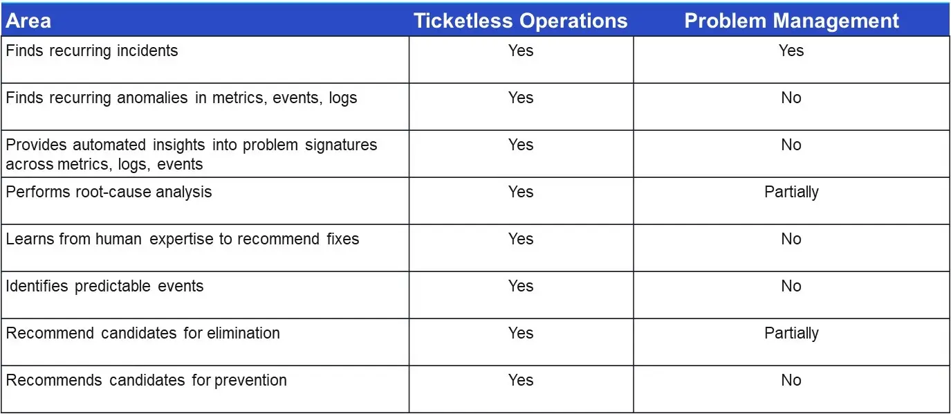 Most traditional problem management solutions revolve around analyzing past tickets to find long-term fixes. The following is a high-level comparison sheet with traditional problem management solutions available in the market.