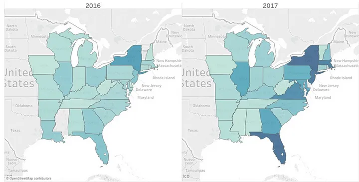 - CFOs of ecommerce websites often make use of such views to quickly glance on the area from where maximum hits come to the website. Below figure shows one such view where the darker areas indicate higher website visits.
